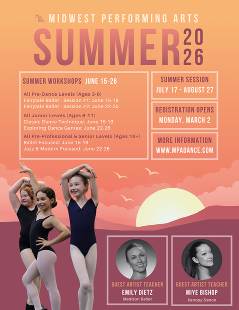 Midwest Performing Arts enhances lives through dance by providing each student with a strong technical base while encouraging them to explore creative and artistic thinking and also inspiring them to increase their body movement potential, physical health, and an appreciation of dance as an athletic art form.